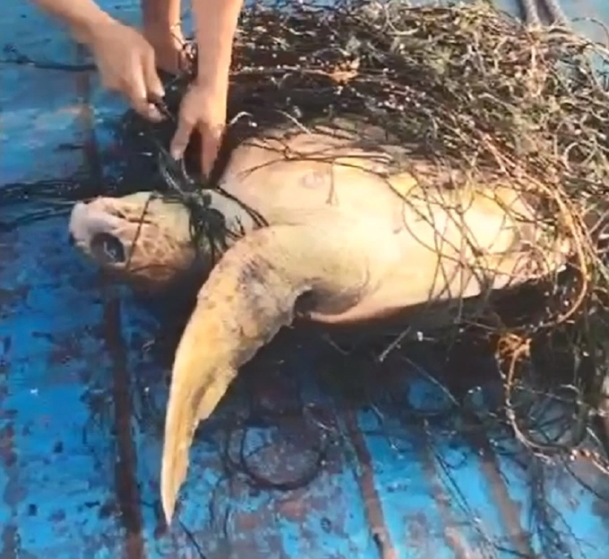 Ngư dân Bình Định gỡ lưới cứu rùa 60 kg